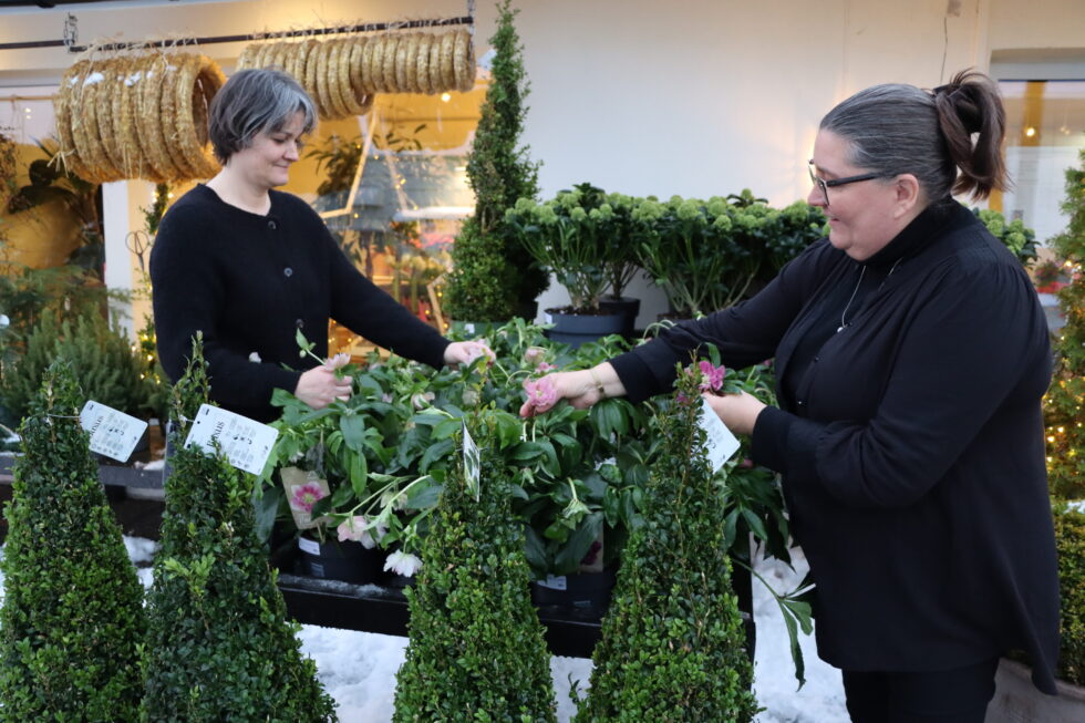 Vinterblomstrar, vintergrøne planter og økologiske julestjerner: Dagleg leiar Susann Misund Larsen og den nye butikksjefen, Ragnhild Johansen, gler...