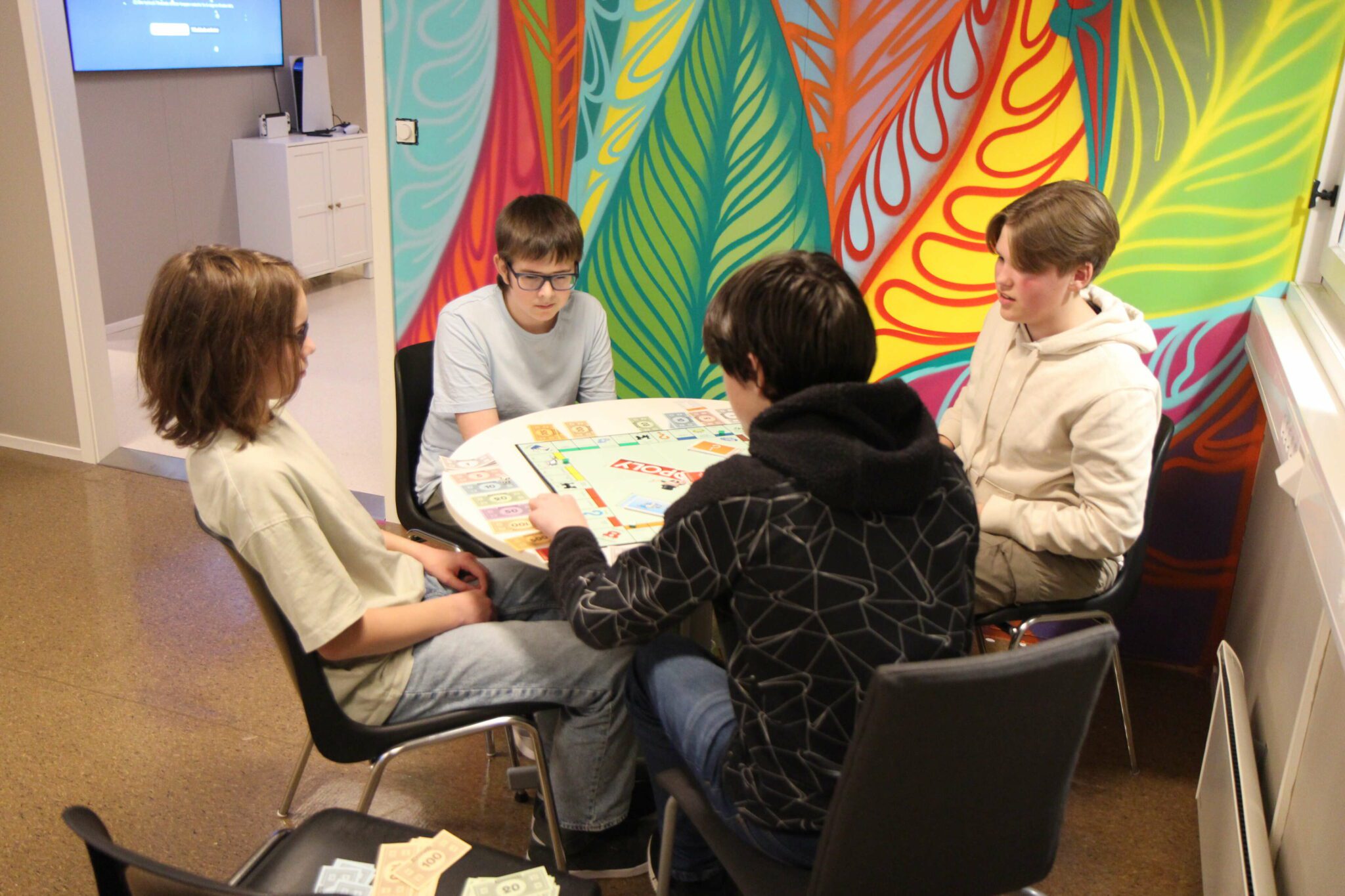 På bordet trillar terningen. Blir det hus eller hotell? Og formuesskatten, kva med den? Ungdomane storkosar seg på ein trygg stad.