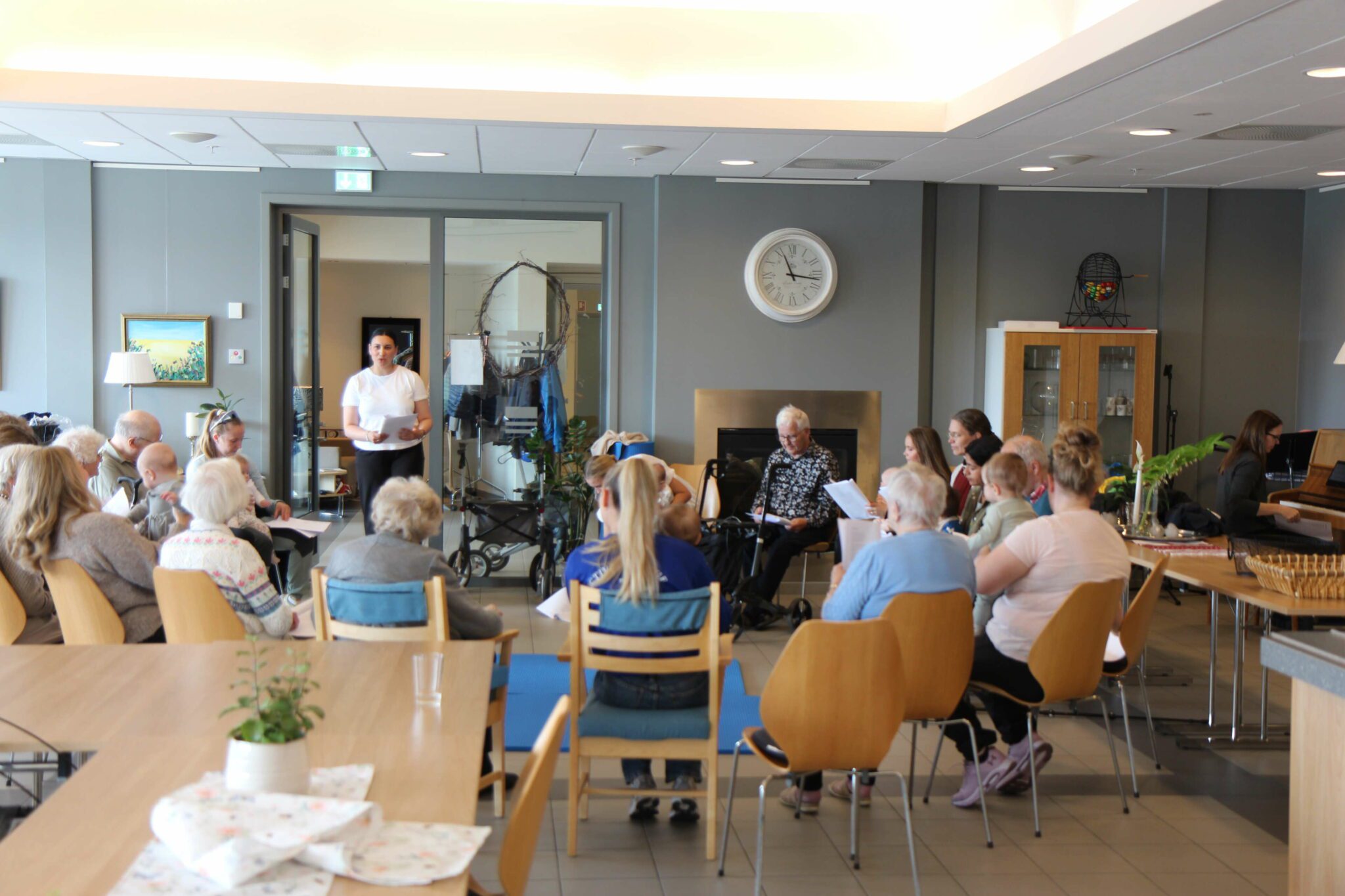 Babysong-gruppa til Emma Dyb hadde tatt turen for å synge saman med brukarar, tilsette og andre i kantina. Der var...
